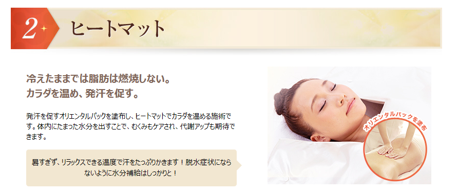 このエステは多く痩身エステにおいてあり、「カラダを温め・引き締める」ことで次のエステの効果を倍増させる狙いがあります。